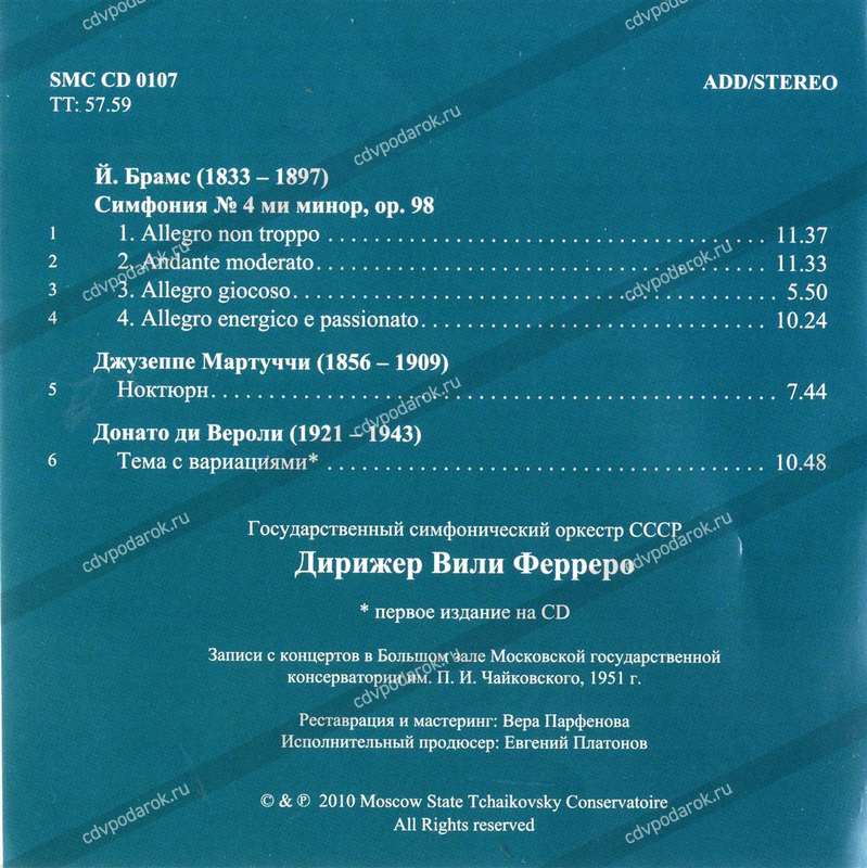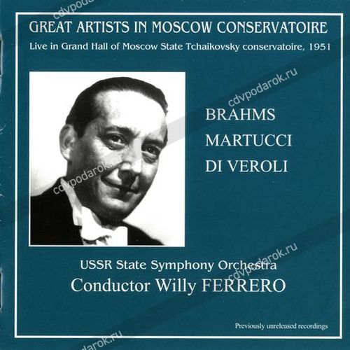 На этом диске — записи концертов в Большом зале Московской консерватории, относящиеся к 1951 году. Интерпретация Вилли Ферреро Четвертой симфонии Й. Брамса раскрывает особенности его исполнительского стиля и дирижерской манеры. С творчеством Джузеппе Мартуччи (1856 — 1909) — итальянского пианиста, композитора, дирижера и педагога — российский слушатель знаком мало. Биографии Дж. Мартуччи и В. Ферреро схожи. Первым учителем музыки для одаренного мальчика стал отец — тромбонист и капельмейстер. Успешный дебют юного пианиста Джузеппе состоялся в семь лет. В 15 лет он окончил неаполитанскую консерваторию по классу фортепиано (у Б. Чези) и композиции (у П. Серрао). С тех пор вел активную концертную деятельность как пианист, позже начал выступать как симфонический и оперный дирижер. Дж. Мартуччи почитали в Италии как интерпретатора музыки Р. Вагнера, Р. Шумана, И. Брамса. В Ноктюрне Дж. Мартуччи слушатель почувствует отголоски глубокого увлечения композитора музыкой И. Брамса. Дж. Мартуччи является автором двух симфоний, оратории «Самуил», двух фортепианных концертов, фортепианного квинтета, трио, фантазии для двух фортепиано, фортепианных пьес, а также инструментальных переложений сочинений И. С. Баха, Г. Ф. Генделя, А. Корелли, В. А. Моцарта. Произведения Дж.Мартуччи включали в свой репертуар многие выдающиеся исполнители — А. Тосканини, Р. Тебальди, Р. Мути и другие.