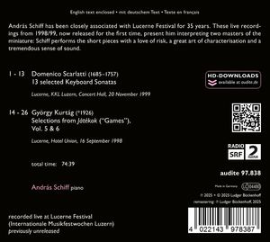 Две концертные записи из Люцерна, выпущенные впервые, показывают сэру Андрашу Шиффу двух композиторов, которые редко встречаются в его дискографии и программах: Доменико Скарлатти и Дьёрдь Куртаг разделены столетиями, но в музыкальном плане они близки как мастера миниатюры. Хотя Андраш Шифф изучал Скарлатти еще во время учебы, этот барочный мастер постепенно исчез из его репертуара. В Люцерне Шифф интерпретировал 13 избранных сонат в продуманной драматургии и - в соответствии с живой ситуацией - представил короткие произведения с готовностью идти на риск, великолепной характеристикой и потрясающим чувством звука. Шифф также представил хорошо продуманную подборку из "Játékok" ("Игры") Дьёрдя Куртага, похожего на дневник сборника фортепианных миниатюр, который он составил на основе предложений самого Куртага. Шифф несколько лет учился у Куртага в Будапеште и почитает его как композитора, который "имеет свое мнение о каждой ноте и точно знает, как он ее слышит", но до сих пор не сделал ни одной записи его музыки. Этим релизом он поздравляет Куртага со 100-летием, которое исполняется 19 февраля 2026 года.