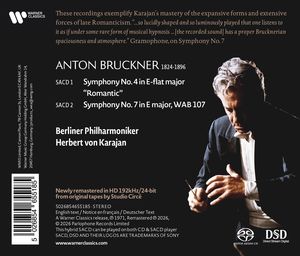 Эти записи - яркие примеры мастерского владения Караяном экспансивными формами и огромными оркестровками позднеромантического периода. Симфонии Брукнера, записанные в 1970-1971 годах, впечатляюще иллюстрируют, насколько изменилось звучание оркестра со времен записей 1950-х годов. Если в силу исторических причин высота голосов в Берлине всегда была несколько выше, то под руководством Караяна оркестр решительно осветлил свою звуковую палитру. При этом он нашел баланс в диапазоне средних частот, который совершенно чужд традиционной немецкой звуковой эстетике. В Берлине Караян проводил прямые линии, непреклонные вертикали и четкие структуры, а также плавные переходы. Он выстраивал оркестр слой за слоем и таким образом выработал целенаправленную стратегию звучания, которая была решительно поддержана выдающимся легато струнной секции. Кроме того, были отброшены все сольные приемы и грации. Берлинский филармонический оркестр теперь играл как единый инструмент - сравнение, которое напомнило не одному меломану звучание органа, когда эти записи были выпущены в 1970-х годах. Абсолютная гармония была достигнута в Симфониях №№ 4 и 7, тональное совершенство которых почти неземное. Это издание было ремастировано студией Circé в 192 кГц / 24 бита с оригинальных пленок. Журнал Gramophone писал о 7-й симфонии: "... настолько четко вылеплена и так светло сыграна, что слушаешь ее как будто под редкой формой музыкального гипноза... Звук обладает поистине брукнеровской широтой и атмосферой"