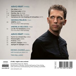 Этот альбом пианиста Рейниса Зариньша и Трио Palladio - особая личная дань уважения композитору Арво Пярту, одному из самых влиятельных композиторов нашего времени. В альбом вошли нестареющие фортепианные произведения Пярта, а также его камерные сочинения, в том числе знаменитые "Для Алины", "Братья" и "Зеркало в зеркале", а также ранние произведения. В программу также включены два произведения латвийских композиторов Георга Пелециса и Андрея Селицкиса, на которых пример и идеи Арво Пярта оказали сильное влияние. Эти два произведения, написанные в 2025 году к 90-летию Арво Пярта, представлены здесь в премьерной записи. С момента своего концертного дебюта в девятилетнем возрасте латвийский пианист Рейнис Зариньш выступал как солист, рецитатор и камерный музыкант по всей Европе, Северной Америке и на Дальнем Востоке. Он участвовал в престижных музыкальных фестивалях, таких как Люцернский фестиваль, а его вдумчивая виртуозность вызывала восторг публики в амстердамском Концертгебау и других концертных залах. Рейнис работал с ведущими оркестрами, такими как Лондонский филармонический оркестр, и с дирижерами мирового класса. Он регулярно выступает в родной Латвии и пять раз был удостоен Большой музыкальной премии своей страны, а также награжден орденом Трех звезд. Трио Palladio объединяет трех выдающихся латвийских солистов, преданных камерных музыкантов и признанных артистов звукозаписи: скрипачку Еву Биндере, виолончелистку Кристину Блаумане и пианиста Рейниса Зариньша. Все трое являются лауреатами Большой музыкальной премии Латвии и получили эту престижную награду как трио в 2024 году. Их первый альбом - "Музыка для фортепианного трио" Петериса Васкса - был назван Gramophone Editor's Choice. Трио Palladio известно своими концептуальными программами, включающими классические, романтические и современные произведения, с особым акцентом на музыку латвийских и балтийских композиторов.