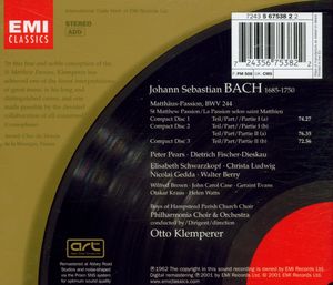 Исполнители: Gedda (Harry Gustaf) Nikolai, tenor / Гедда (Гарри Густав) Николай, тенор Fischer-Dieskau Dietrich, baritone / Фишер-Дискау Дитрих, баритон Schwarzkopf Elisabeth, soprano / Шварцкопф Элизабет, сопрано Berry Walter, bass / Берри Вальтер, бас Ludwig Christa, mezzo / Людвиг Криста, меццо Evans Geraint, baritone / Эванс Герайнт, баритон Watts Helen, mezzo / Уоттс Хелен, меццо Case John Carol, bass / Кейс Джон Кэрол, бас Kraus Otakar, baritone / Краус Отакар, баритон Pears Peter, tenor / Пирс Питер, тенор Johann Sebastian Bach (1685-1750) / Johann Sebastian Bach (1685-1750)
