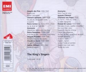 Композиторы: Despréz, Josquin / Депре Жоскен Traditional / Traditional Lassus (Lasso), Orlando de / Лассо (Лассю) Орландо де Certon, Pierre / Кретон Пьер Willaert, Adrian / Вилларт Адриан Janequin, Clément / Жанекен Клеман Le Jeune, Claude / Ле Жён Клод Clemens non Papa, Jacobus / Клеменс-не-Папа Якоб Arcadelt, Jacques / Аркадельт Якоб Passereau, Pierre / Пассеро Пьер