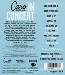 Каро Эмеральд - замечательный сценический музыкант с фантастическим голосом и пленительной личностью, и на этом концерте она предстает в превосходной форме. Бонусные материалы включают интервью с ней и запись репетиции группы.