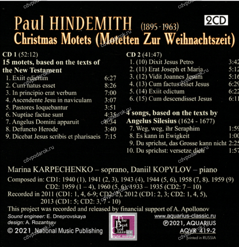 Хиндемит Пауль "Мотеты, подаренные на Рождество" 2CD/ MARINA KARPECHENKO (Soprano),Daniil Kopylov : Motetten zur Weihnachtszeit (Christmas Motets); 4 Songs based on texts by Angelus Silesius (all Hindemith).