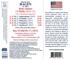 "Дуэт играл с точностью и глубоким чувством... Произведение представляло собой убедительное, грандиозное повествование о жизни женщины в Японии XII в. Полное идиоматического колорита, оно убедительно использовало приемы западной классической традиции,...Альбом Duo YUMENO на лейбле Naxos содержит полную версию Heike Quinto, сюиты из пяти частей для кото, виолончели и голоса, написанной Дароном Хагеном. Пьесы вдохновлены средневековым японским эпосом "Сказание о Хейке" и посвящены женским персонажам, ищущим искупления и мира во время войны.