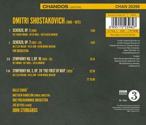 В пятой части симфонического цикла Дмитрия Шостаковича Джон Сторгордс обращается к одним из самых ранних оркестровых сочинений композитора. Оркестровое скерцо было излюбленным заданием преподавателей композиции того времени: относительно простая форма, тем не менее, требует от ученика создания контрастного материала для крайних и средних частей и эффективного оформления переходов. Неудивительно, что эта форма играет важную роль в ранних произведениях Шостаковича, а также Игоря Стравинского, Белы Бартока и многих других. Два примера, записанные здесь, демонстрируют способности и стиль молодого композитора, даже если его композиторский голос еще не полностью принадлежит ему. Однако в обоих произведениях прослеживается связь с более поздней Первой симфонией, которая была написана в качестве выпускного экзамена по композиции в Петроградской консерватории. Шостакович работал над ней два года, и появившаяся симфония сразу же принесла ему успех и сделала его вундеркиндом среди советских композиторов. Третья симфония, написанная четыре года спустя, свидетельствует не только о стремительном развитии Шостаковича как композитора, но и о столь же стремительных изменениях в мире, в котором он жил. В декабре 1926 года он сдал только что введенный экзамен по марксистской идеологии и смог продлить свое зачисление в качестве аспиранта Ленинградской консерватории до начала 1930 года. Он представил симфонию с объяснением, что она выражает "праздничное настроение мирной реконструкции". Уже на раннем этапе первой сталинской пятилетки было ясно, что он осознал, что политическая пропаганда будет иметь решающее значение для его творческого выживания.