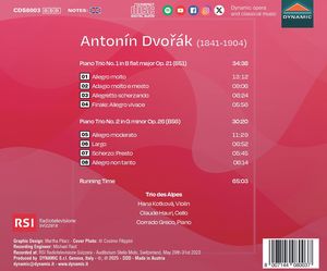 Камерная музыка Антонина Дворжака - одна из самых значительных в XIX веке, а четыре сохранившихся фортепианных трио демонстрируют его совершенное владение формой. Первые два были написаны в кратчайшие сроки: №1 си-бемоль мажор сочетает шубертовскую лирику со славянскими влияниями, спокойствие с радостью. №2 соль минор более классичен, хотя имеет ту же формальную структуру, что и №1, и излучает ту же степень лирической красоты. Трио des Alpes было основано в 2010 году и состоит из трех сильных личностей, которые стремятся к высшей цели камерной музыки: гармонично соединить три голоса в единое звучание. Их первый альбом на лейбле Dynamic, выпущенный в 2015 году, включает произведения Бича, Буланже и Кларка. Кроме того, в копродукции с RSI они записали полное фортепианное трио Дворжака. Первая часть серии, включающая трио op. 65 и 90, была удостоена 5 звезд итальянского журнала Musica.