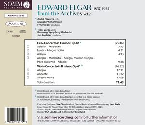 Новая серия "Элгар из архивов" от SOMM Recordings исследует музыку Эдварда Элгара с помощью редких архивных записей не только известных британских исполнителей, но и менее известных, но не менее достойных зарубежных дирижеров и солистов. Во второй части серии представлены исторические концертные записи Скрипичного концерта си минор op. 61 с Тибором Варгой и Концерта для виолончели ми минор op. 85 с Андре Наваррой.
