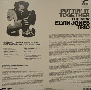 Дебютный альбом Элвина Джонса на Blue Note "Puttin' It Together" 1968 года ознаменовал начало новой главы в карьере барабанщика после шести лет работы в новаторском квартете Джона Колтрейна и смерти Колтрейна в 1967 году. На альбоме, состоящем из стройных трио, Джонс блистает в живом трехстороннем диалоге с басистом Джимми Гаррисоном и мультиинструменталистом Джо Фарреллом.