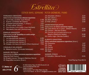Лирическое сопрано Эстер Райо и знаменитый пианист и дирижер Петер Грюнберг представляют коллекцию чувственных классических испанских песен для голоса и фортепиано. Эта программа была впервые исполнена в серии концертов, организованной в Сан-Франциско организацией LIEDER ALIVE! В альбом вошли песни испаноязычных композиторов начала XX века: Фернандо Обрадорса, Мануэля де Фальи, Энрике Гранадоса, Альберто Гинастеры, Хавьера Монтсальватге, Консуэло Веласкес и Мануэля Понсе. Эти живые песенные циклы, вдохновленные классической испанской поэзией и региональными...