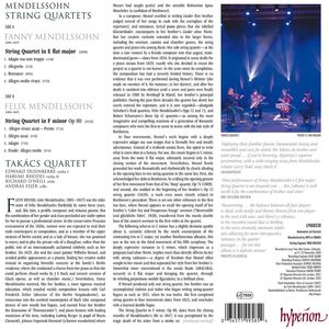 Страстный струнный квартет Мендельсона op. 80 был написан как очень личная реакция на смерть его сестры Фанни в мае 1847 года, всего за несколько месяцев до его столь же внезапной смерти в возрасте всего 36 лет. На этой записи Квартет Такача разумно сочетает это произведение со струнным квартетом Фанни Хензель и юношеским произведением композитора.