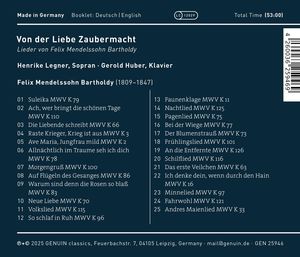 Пресса называет сопрано Хенрике Легнер, которая представляет свой дебютный альбом на GENUIN, "обещанием". Она представляет нам необыкновенный, романтический песенный репертуар, жемчужины которого поражают нас снова и снова: Избранные песни Феликса Мендельсона Бартольди, включая самые красивые из его наследия, собраны на альбоме. В сопровождении пианиста Герольда Хубера чистый и выразительный голос Хенрике Легнер поет две дюжины прекрасных жемчужин прямо в наши сердца - волшебно!
