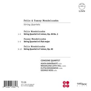 Квартет Consone продолжает знакомство со струнными квартетами Феликса Мендельсона и во второй части цикла обращается к единственному произведению Фанни Мендельсон в этом жанре. Несмотря на страстно-эмоциональный характер, Струнный квартет ми минор op. 44 № 2 был написан Феликсом через три месяца после его женитьбы - в период личной стабильности и творческого подъема. Струнный квартет фа минор op. 80, который он написал после внезапной смерти сестры, резко контрастирует с этим - потрясенный и травмированный. Это произведение поразительной горечи и внутреннего смятения - беспристрастное выражение его эмоционального состояния. Струнный квартет ми-бемоль мажор Фанни - привлекательное, тщательно продуманное произведение, которое осталось неопубликованным при ее жизни - не в последнюю очередь потому, что ее семья отговаривала ее от композиторской карьеры. Он был опубликован посмертно только в 1988 году. Квартет Consone, ставший первым струнным квартетом с оригинальным звучанием, который был включен в программу BBC "Артисты нового поколения", придает этому произведению живой, впечатляющий голос.
