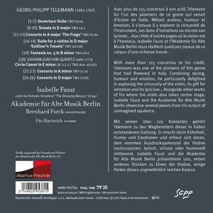 NDR Kultur: "Изабель Фауст и Бернхард Форк великолепно дополняют друг друга. Они невероятно ярко...Телеман, написавший более 125 концертов, является одним из пионеров этого жанра, зародившегося в Италии. В них он смешивает смелость, юмор и эмоции и с удовольствием исследует огромный выразительный потенциал скрипки: лирический, виртуозный или шутливо-имитационный. Изабель Фауст и Берлинская академия старинной музыки представляют несколько жемчужин из этого необычайно богатого наследия, а также другие произведения, посвященные скрипке.