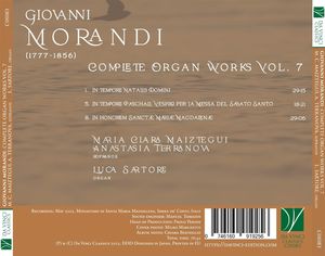 Седьмой том полного собрания органных сочинений Джованни Моранди проливает новый свет на итальянскую литургию эпохи романтизма. Его пасторальные сочинения, мотеты и процессии сочетают торжественные ритуалы с нежным народным благочестием. Sinfonia in Pastorale и Tantum ergo демонстрируют талант Моранди создавать атмосферу, легко переходя от возвышенности к интимной нежности. Сопрано Мария Клара Майцтеги и Анастасия Терранова исполняют сияющие вокальные партии, а Лука Сарторе привносит теплые язычки, лирические флейты и ясность органного проспекта в исторический орган Дженнари (1828).