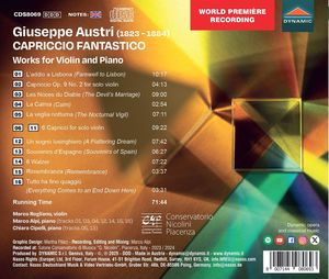 Хотя им восхищались такие известные личности, как Россини и Верди, скрипач и композитор Джузеппе Аустри был практически забыт, в отличие от его великих современников Паганини, Сивори и Баццини. Эти первые записи показывают, насколько образны и виртуозны его произведения для скрипки и фортепиано, и позволяют предположить, что он был интерпретатором с выдающимися техническими и выразительными способностями. Аустри был в традициях великих странствующих виртуозов своего времени, и хотя его композиции иногда напоминают Паганини, он сочетает зажигательные пассажи с изящным кантабиле и интимной нежностью.