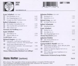 Исполнители: Moore Gerald, piano / Мур Джеральд, фортепиано Hotter Hans, bass-bariton / Хоттер Ханс, бас-баритон Raucheisen Michael, piano / Раухайзен Михель, фортепиано Nordberg Hermann von, piano / Нордберг Герман фон, фортепиано