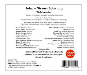 Как раз к 200-летию Иоганна Штрауса II, которое отмечается 25 октября 2025 года, компания cpo выпускает полную музыкальную запись комедии, которая 4 декабря сама отметит свое 130-летие. В "Вальдмейстере" бесспорный король вальса снова выжал все возможное из своего мастерства и поставил восхитительную комедию, скандальные путаницы которой в конце концов растворяются в высокопробном пунше, а неповторимый аромат придают ботанический титульный герой (Galium odoratum) и ряд вечнозеленых песен - прежде всего лейтмотивная и поговорка "Trau schau wem", в которой с энтузиазмом участвуют все его товарищи и соперники. Эта живая запись была сделана на венском гостевом спектакле Государственного театра на площади Гертнерплац, который своей новой постановкой внес вклад в австрийское празднование Штрауса в этом году.