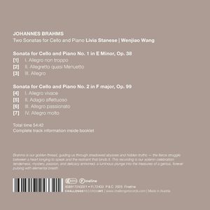 В этом альбоме собраны две виртуозные сонаты для виолончели и фортепиано Иоганнеса Брамса - произведения, которые часто называют "завуалированными симфониями" из-за их симфонической широты в рамках камерной музыки. Написанные с разницей более чем в два десятилетия, сонаты демонстрируют глубокую любовь Брамса к виолончели - инструменту, которому он обучался в юности, - и его глубокое приобщение к музыкальным традициям от Баха до Бетховена. Соната ми минор op. 38, задуманная как дань уважения Баху, разворачивается с впечатляющей интенсивностью и сочетает романтическую выразительность с контрапунктической строгостью. Удлиненная первая часть, вдохновленный танцем менуэт и фугальный финал воплощают способность Брамса сочетать исторические влияния с новым эмоциональным резонансом. Фа-мажорная соната op. 99, написанная во время очень плодотворного лета на озере Тун в 1886 году, демонстрирует совершенно другого Брамса: пламенного, страстного и смело лиричного. Написанное для виолончелиста Роберта Хаусмана, произведение начинается с бурных фортепианных тремоланди и восходящих линий виолончели, а затем переходит в нежную, похожую на гимн медленную часть. Драматическое скерцо, полное ритмической энергии, и игривый, но триумфальный финал завершают сонату, в которой нашли выражение как интеллектуальная глубина Брамса, так и его буйная сторона. Современные критики, возможно, разделились во мнениях относительно ее достоинств, но с тех пор фа-мажорная соната признана краеугольным камнем виолончельного репертуара.