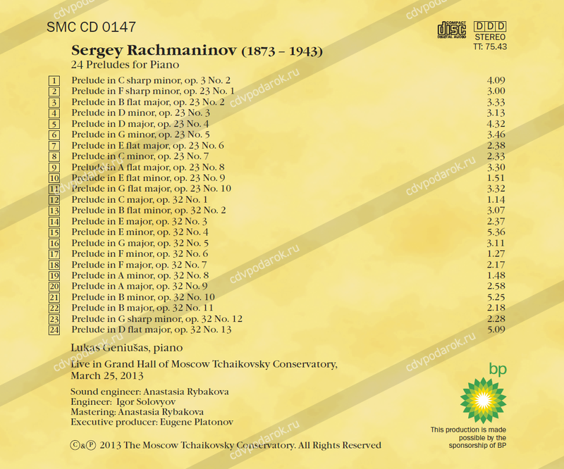 Монографический проект 24 прелюдии Рахманинова, представленный на этом диске, был записан с концерта в Большом Зале Московской консерватории 25 марта 2013 года. Вот как отзывается в журнале «Piano Форум» об исполнении Л. Генюшасом прелюдий Рахманинова известный музыкальный критик П. Картуш: «.... ушам моим был подарен поразительный эффект глу-боко индивидуального, совершенно выполненного воплощения рахмани-новского цикла. С первого прикосновения к клавиатуре стало ясно –перед нами пианист мирового класса. Это уже не юное дарование, а чудесный и зрелый мастер с непредвидимой перспективой развивающегося таланта, который способен в каждой фазе эволюции явить качества, отмеченные единичностью. Легко предвидеть блестящий путь артиста, когда этот путь уже начался...»