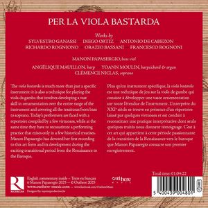 Виола бастарда - это не просто особый инструмент: под этим термином подразумевается техника игры на виоле да гамба, при которой развивается всестороннее владение орнаментикой во всем диапазоне и охватываются все тесситуры от баса до сопрано. Перед современными исполнителями стоит задача освоить репертуар, который был составлен лишь несколькими виртуозами, и в то же время реконструировать исполнительскую практику, сохранившуюся лишь в нескольких исторических трактатах. Манон Папасерджио посвятила свою первую запись этому виду искусства и его развитию в захватывающий переходный период от Ренессанса к барокко.