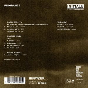 Этот диск, озаглавленный "Filigranes", объединяет три произведения, которые, хотя и относятся к разным эпохам, связаны общим поэтическим измерением. Трио Равеля сплетает мелодии в плавное повествование, несущее в себе удивительные вдохновения и огромное богатство гармонических красок. В этих трех произведениях музыка и литература переплетаются, накладываясь друг на друга во времени и пространстве, позволяя поэзии проявляться не только через слова, но и через тонкое взаимодействие мелодии, гармонии и тембра.