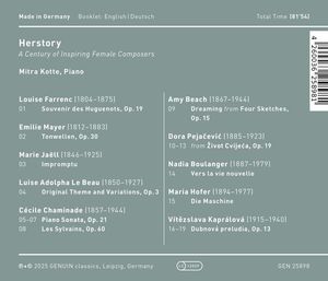 Митра Котте вновь обращается к истории музыки и ставит на первое место женщин-композиторов XIX и XX веков. Кто знает произведения Луизы Фарренк, Сесиль Шаминад или Эмилии Майер так, как они того заслуживают? С большой энергией и на высочайшем техническом уровне она знакомит нас с драгоценными жемчужинами и весомыми произведениями, которыми мы восхищаемся глазами и ушами!