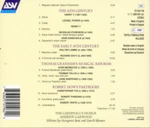 Композиторы: Tye, Christopher / Тай Кристофер Tallis, Thomas / Таллис Томас Parsons, Robert / Парсонс Роберт Dunstable, John / Данстейбл Джон Power, Leonel / Пауэр Лионель White (Whyte), Robert / Уайт Роберт Sheppard, John / Шеппард Джон Sturgeon, Nicholas / Стёрджн Николас Lambe, Walter / Лэмб Вальтер Davy, Richard / Дейви Ричард Marbeck (Merbeck; Merbecke), John / Марбек (Мербек) Джон Henry V / Генрих V
