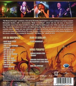 "No Means Of Escape" объединяет концерт Nazareth, записанный перед избранной публикой в знаменитой лондонской студии Metropolis Studios. С документальным фильмом "Made In Scotland", в котором рассказывается вся история группы, начиная с ее образования в 1968 году и заканчивая прорывом в 1970-х годах и тем, что группа сохраняет свое значение и в наши дни. В концерт вошли любимые хиты всех лет их карьеры, такие как "Love Hurts", "Hair Of The Dog", "Razamanaz", "May The Sun Shine", "Bad Bad Boy", "This Flight Tonight" и "Expect No Mercy".