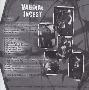 Vaginal Incest берет на себя B-сторону с натиском, который\u2019 столь же беспощаден, выпуская такие треки, как "Nuclear Anus" и "Genital Pulverizer", которые раздвигают границы того, чего может достичь экстремальная музыка. Немецкий квартет представляет свой фирменный бренд сверхбыстрого, сверхтяжелого грайндкора, сочетающего техническое мастерство с сырой, первобытной агрессией. Все треки, представленные здесь, ранее не издавались, что делает этот сплит незаменимым для коллекционеров и поклонников экстремальной музыки. T
