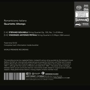 Новый альбом Quartetto Altemps "Romanticismo Italiano" объединяет два необыкновенные, долгое время остававшиеся незамеченными голоса Италии XIX века: Стефано Голинелли и Винченцо стефано Голинелли и Винченцо Антонио Петрали. Как новое открытие "двух сокровищ итальянского музыкального наследия", которое заполняет очевидную Очевидную пустоту в итальянской камерной музыке той эпохи, эта мировая премьера записи Мировая премьера записи показывает, как два выдающихся виртуоза-клавишника, прославленный пианист и Знаменитый пианист и знаменитый органист, берутся за струнный квартет - высший Жанр камерной музыки. В струнном квартете Голинелли op. 100 № 1 си минор (1854) оперная интенсивность и гармоническая неугомонность встречаются со структурной ясностью структурной ясности австро-немецкой традиции, с отголосками Гайдна, Бетховена отголосками Гайдна, Бетховена, Мендельсона и Шуберта, не теряя при этом не теряя безошибочно итальянского лирического импульса. Квартет соль мажор Петрали, представленный здесь в переработанном варианте 1884 года, отражает зрелый и глубоко личный синтез: итальянская кантабильная теплота переплетается с Теплотой, переплетающейся с контрапунктическим мастерством, вдохновленным вдохновленным центральноевропейскими образцами. На основе тщательного Исследований оригинальных источников и манускриптов, Квартет Altemps подходит к этому репертуару в духе музыкантов, исполняющих музыку своего Времени с перспективным, живым и выразительным подходом. Сайт Результат - это больше, чем историческая реконструкция: это мощное художественное художественное заявление, которое возвращает этим произведениям их законное место и возрождает забытую главу романтической Италии со страстью, стилистическим Страстью, стилистической осведомленностью и убедительной глубиной интерпретации Глубина интерпретации.