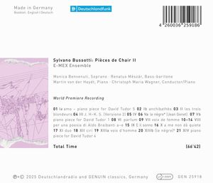 Феноменальный ансамбль E-MEX вместе с солистами Моникой Бенвенути и Ренатусом Мешаром исполняет первое крупное произведение Сильвано Буссотти. Pièces de Chair II 1958 года - это произведение огромного поиска и безудержной радости эксперимента, чьи провокационные звуки и сегодня оказывают на слушателя захватывающее и новое воздействие.