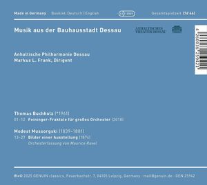Один из старейших и традиционных оркестров Саксонии-Анхальт представляет в GENUIN по случаю 100-летия переезда Баухауза из Веймара в Дессау захватывающее сочетание двух великих оркестровых произведений: Анхальтский филармонический оркестр Баухауза города Дессау под руководством главного музыкального руководителя Маркуса Л. Франка сочетает "Картинки с выставки" Мусоргского (в оркестровой версии Равеля) с "Фракталами Файнингера" композитора из Айзенаха Томаса Буххольца, родившегося в 1961 году. Два оркестровых произведения, тесно связанные с изобразительным искусством. Тонко сплетенная ткань Томаса Буххольца, чье творчество связано с мастером Баухауза Лионелем Файнингером, и бесконечные краски Мусоргского/Равеля находятся в лучших руках традиционного оркестра Дессау. Оркестр играет великолепно, но не помпезно, виртуозно, но наполненно смыслом, под руководством своего главного дирижера с умом и изысканностью.